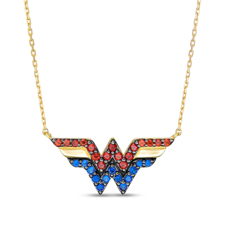 Crafted in warm 10K gold, this eye-catching design features bright blue sapphires and regal garnets bringing color to the classic "WW" logo. Buffed to a brilliant buffed luster, this look suspends centered along a 15.0-inch cable chain with 2.0-inch extender that secures with a spring-ring clasp.This exclusive fine jewelry collection inspires you to wear your strength, confidence and power.